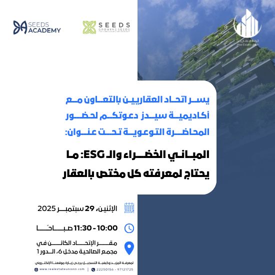 يسر اتحاد العقاريين بالتعاون مع أكاديمية سيـدز دعوتكم لحضور المحاضرة التوعوية تحت عنوان “المباني الخضراء والـ ESG: ما يحتاج لمعرفته كل مختص بالعقار”